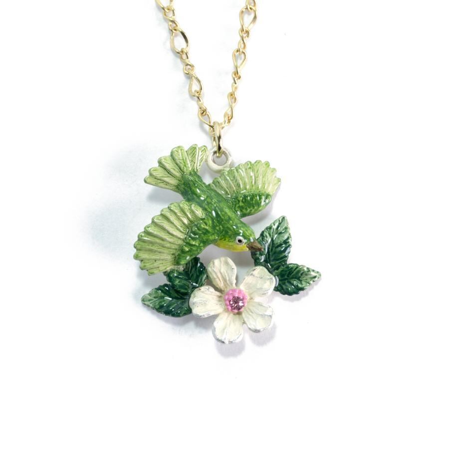 メジロがリンゴの花の蜜を吸いに飛んできた様子をイメージしたネックレス。