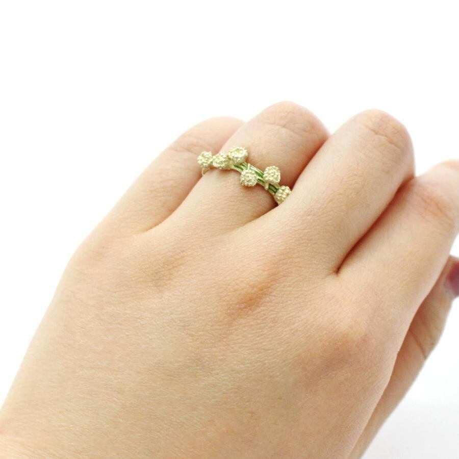 シロツメクサの花かんむりをモチーフにしたリング。