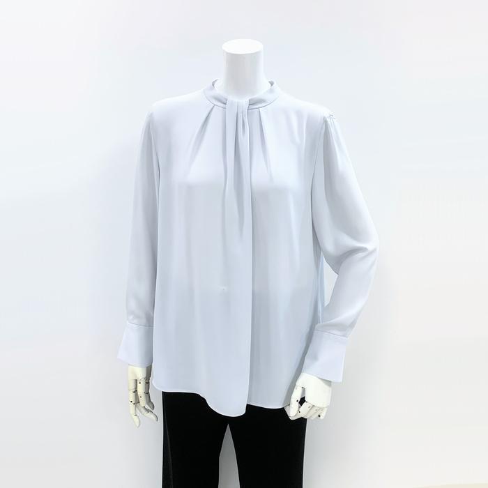 衿のデザインがポイントのブラウスは、衿元からタック使いのドレープが流れるようなデザイン。