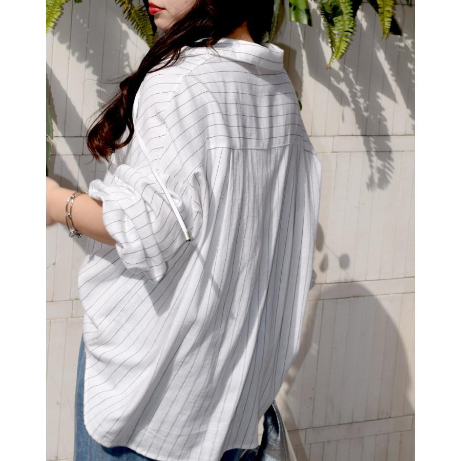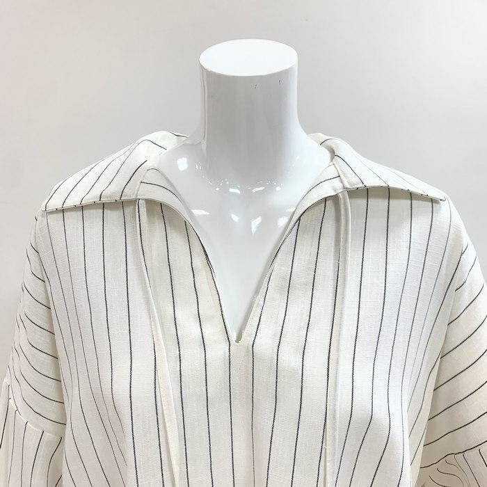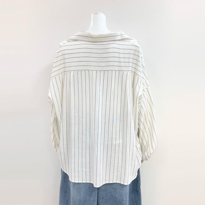 綿麻素材にピンストライプの柄が入ったスキッパーシャツブラウス