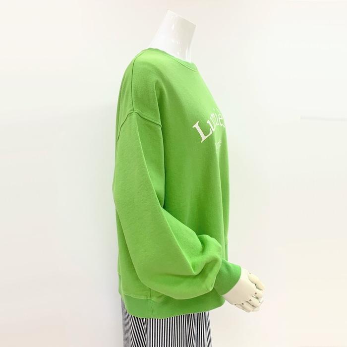 明るく爽やかなライトグリーンが目を惹くロゴトレーナー