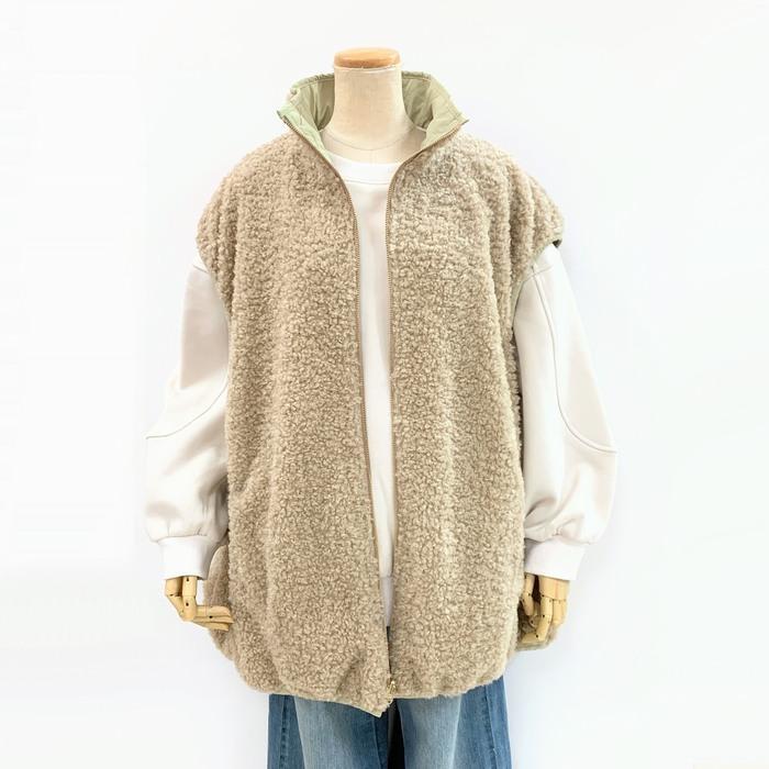 スポーティなナイロン素材とかわいいボア素材がリバーシブルになったワイドベスト。
