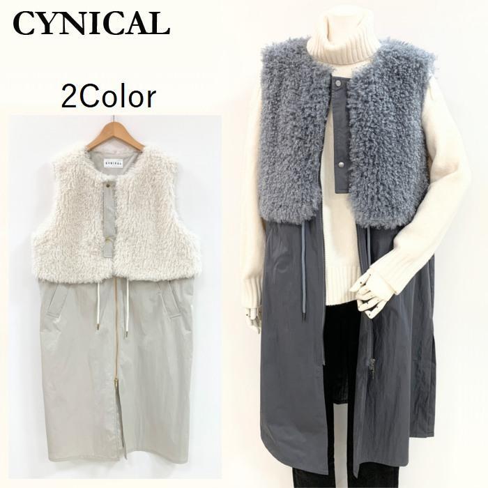 Cynical ボア切替ロングジレ 552-94029 cynical シニカル ベスト プードルファー エコ フェイクファー ハイウエスト切替 ドロスト ジップ 防寒 超軽量 暖かい 秋冬 | marsh*mallow