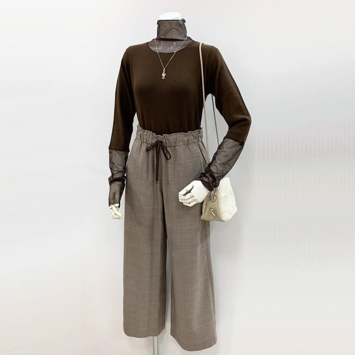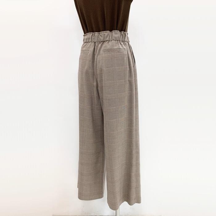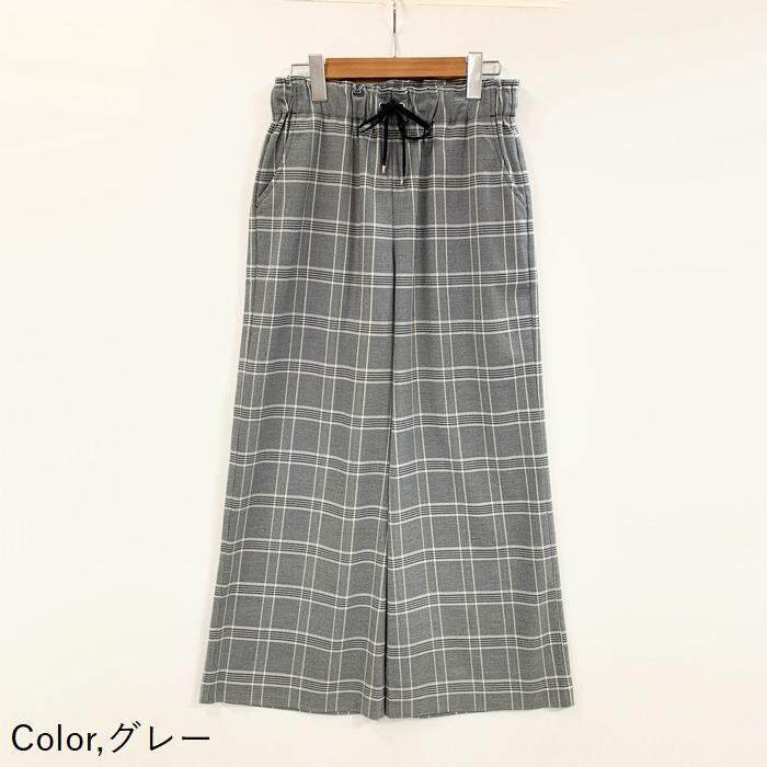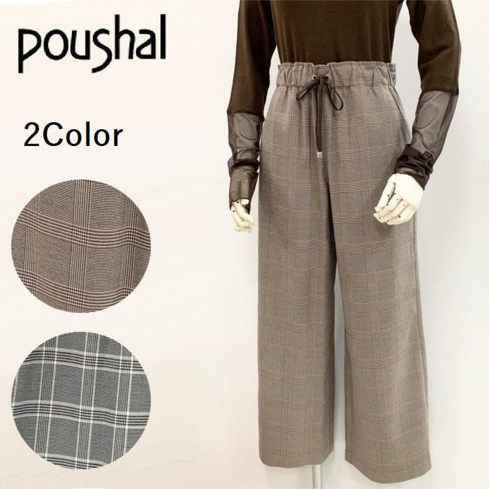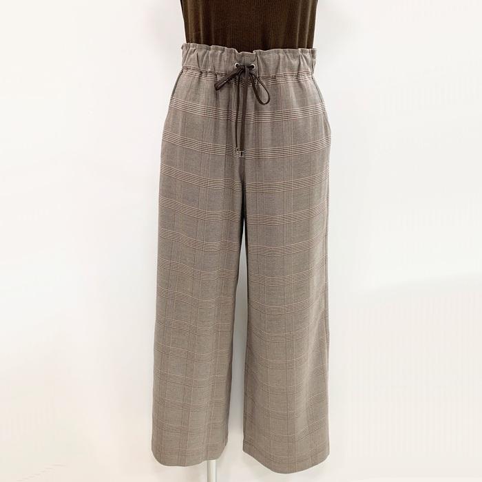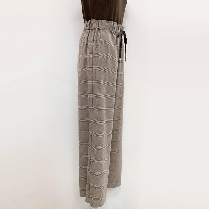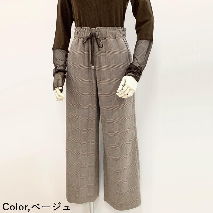 ワールド チェック柄ストレッチワイドパンツ 012-64400 poushal ウエストゴム仕様 洗える ゆったり 伸縮 ブラウン ブラック レディース オールシーズン レディース | marsh*mallow