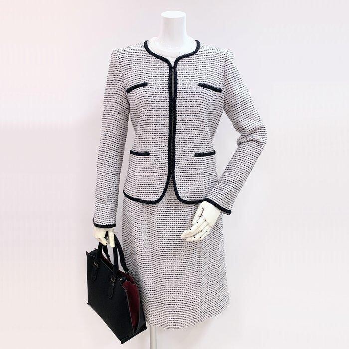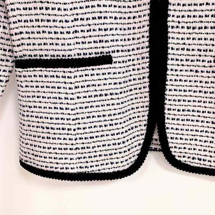 ホワイト×ピンク×ブラックのツイード生地には、シルバーのラメ糸を織り込み、控えめながらも美しく華やかな表情に。
