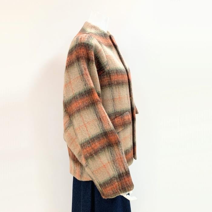 ベージュをベースに、オレンジ・ブラウン・グリーンを重ねたニュアンスチェックが大人の装いに程よい華やかさをプラス。