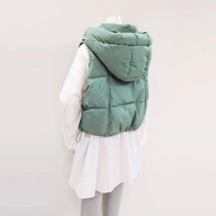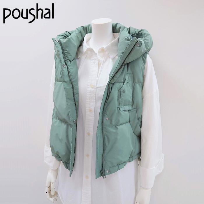 裾ドロスト付きショート丈中綿ベスト 012-24430 poushal ミントグリーン サックスブルー フード付き ジップ 春秋冬 トレンド レディース
