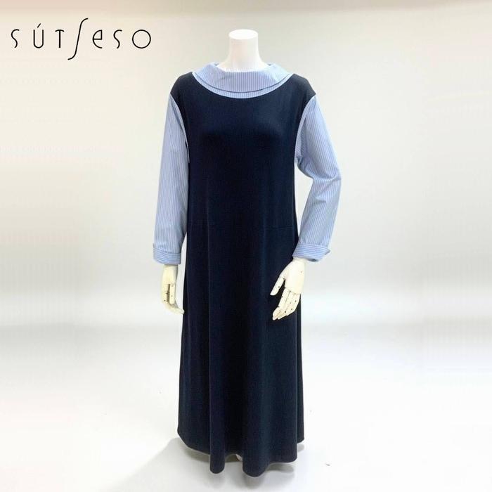 ショールカラードッキングワンピース 前後2way 033-54301 sutseso 洗える ネイビー 切り替え ロング丈 伸縮 ポケット付き お呼ばれ 華やか ストライプブラウス