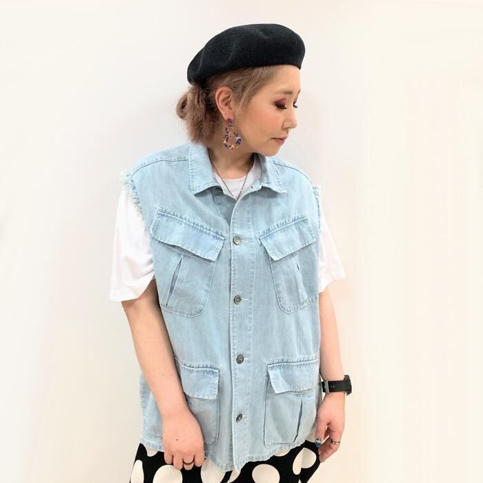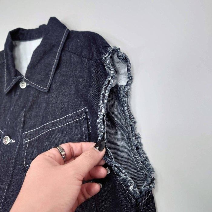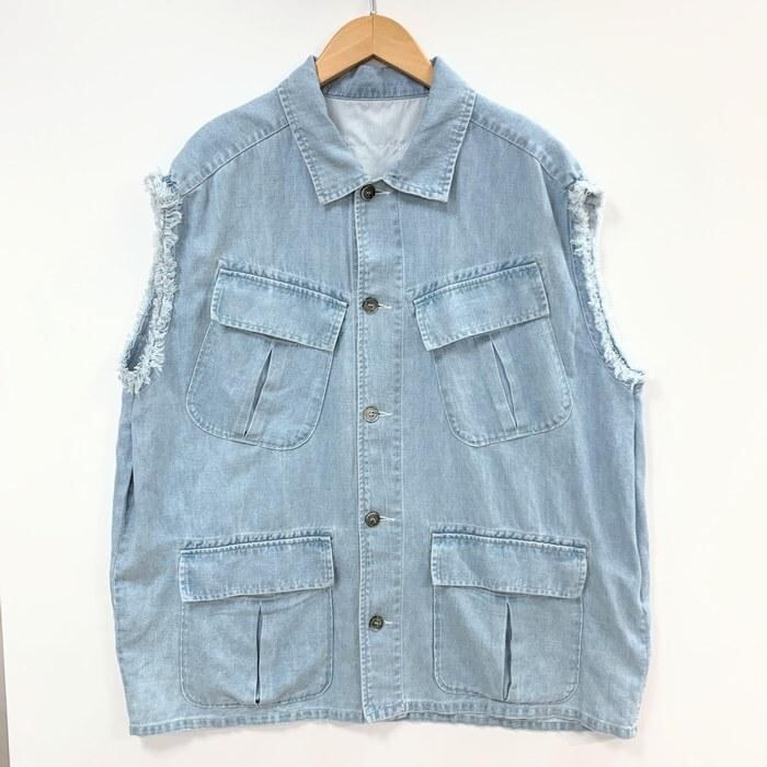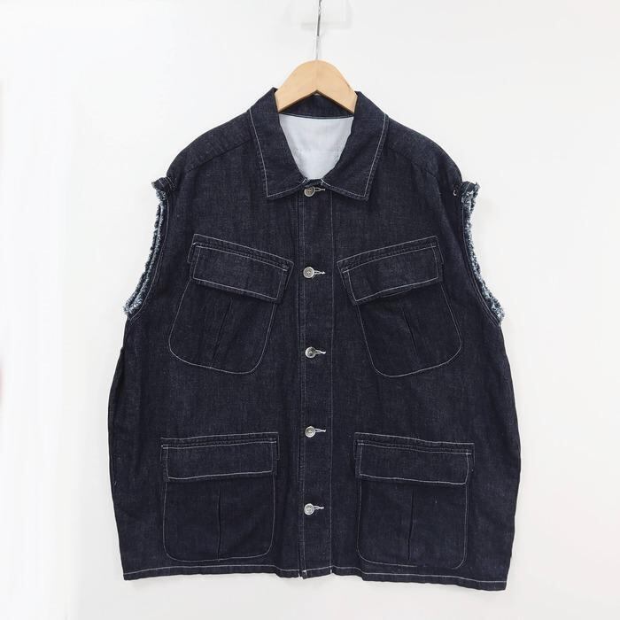 袖口フリンジ仕様の4ポケットデニムベスト。