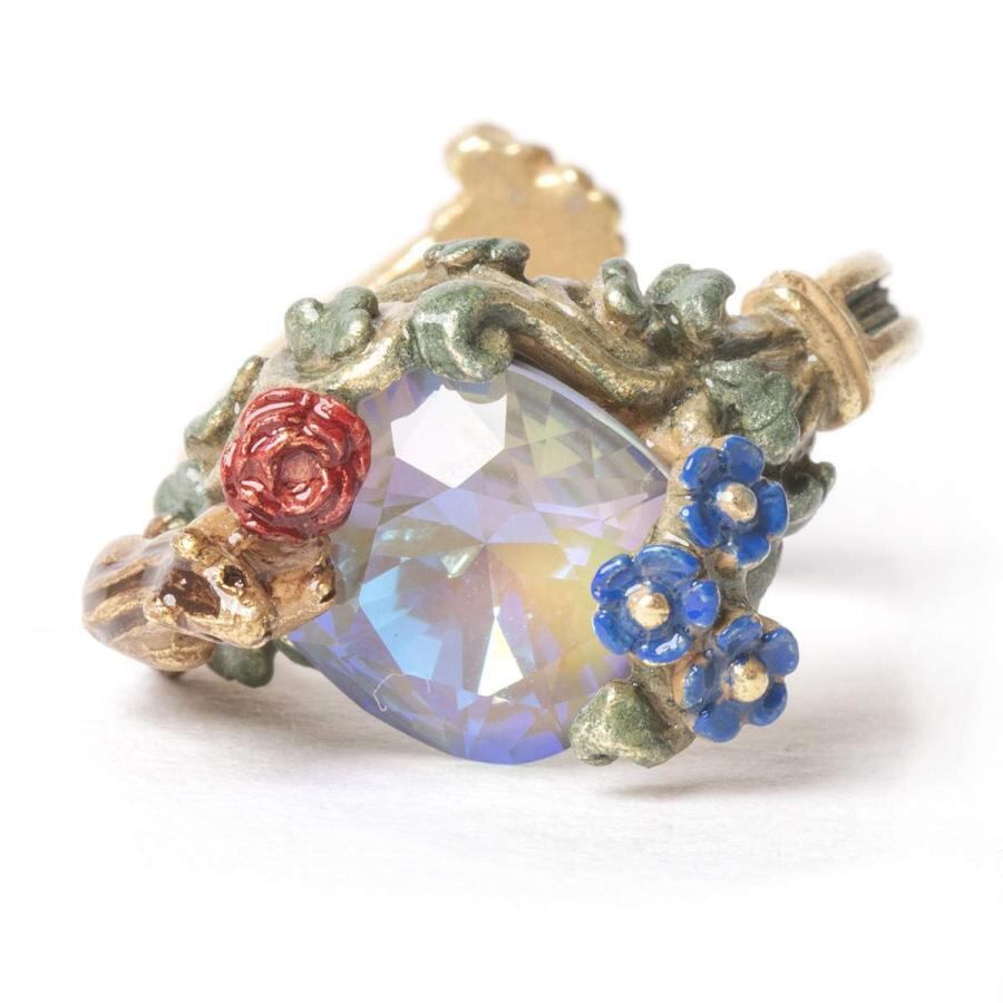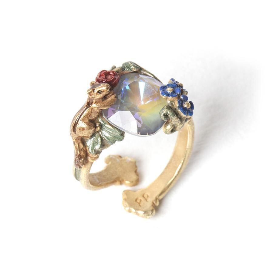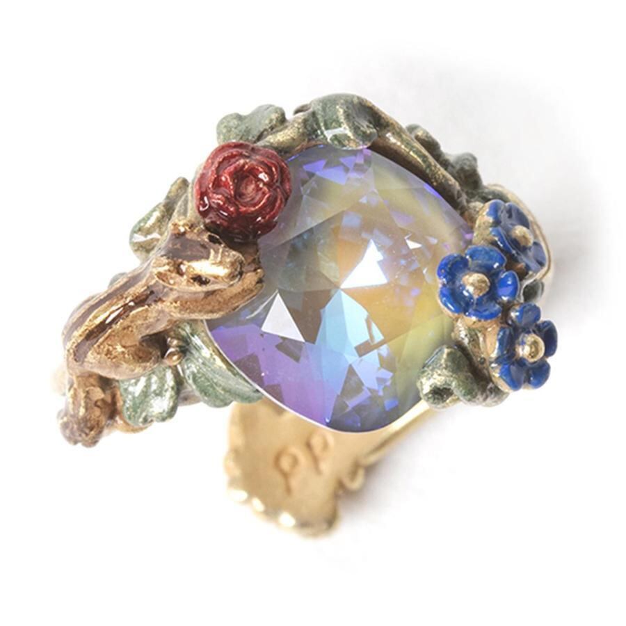 淡く輝く石を抱え込むように蔦が絡まり、青い花や赤い花で飾られた様子が珍しいのか、リスはその不思議な光景に目を奪われているよう。